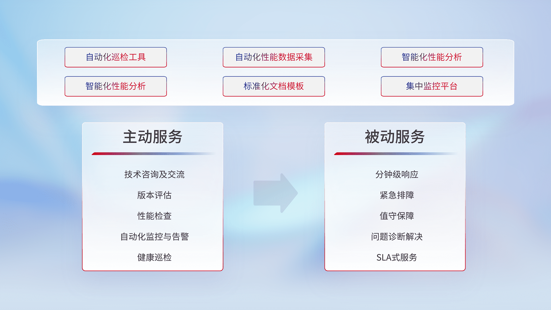 智能化工具和标准化文档,,保障服务质量,,,提供主动服务(包含技术咨询、、版本评估、、性能检查、、、、自动化监控与告警、、、健康巡检)和被动服务包含(分钟级响应、、、、紧急排障、、、值守保障、、、、问题诊断解决、、、、SLA服务)。。。
