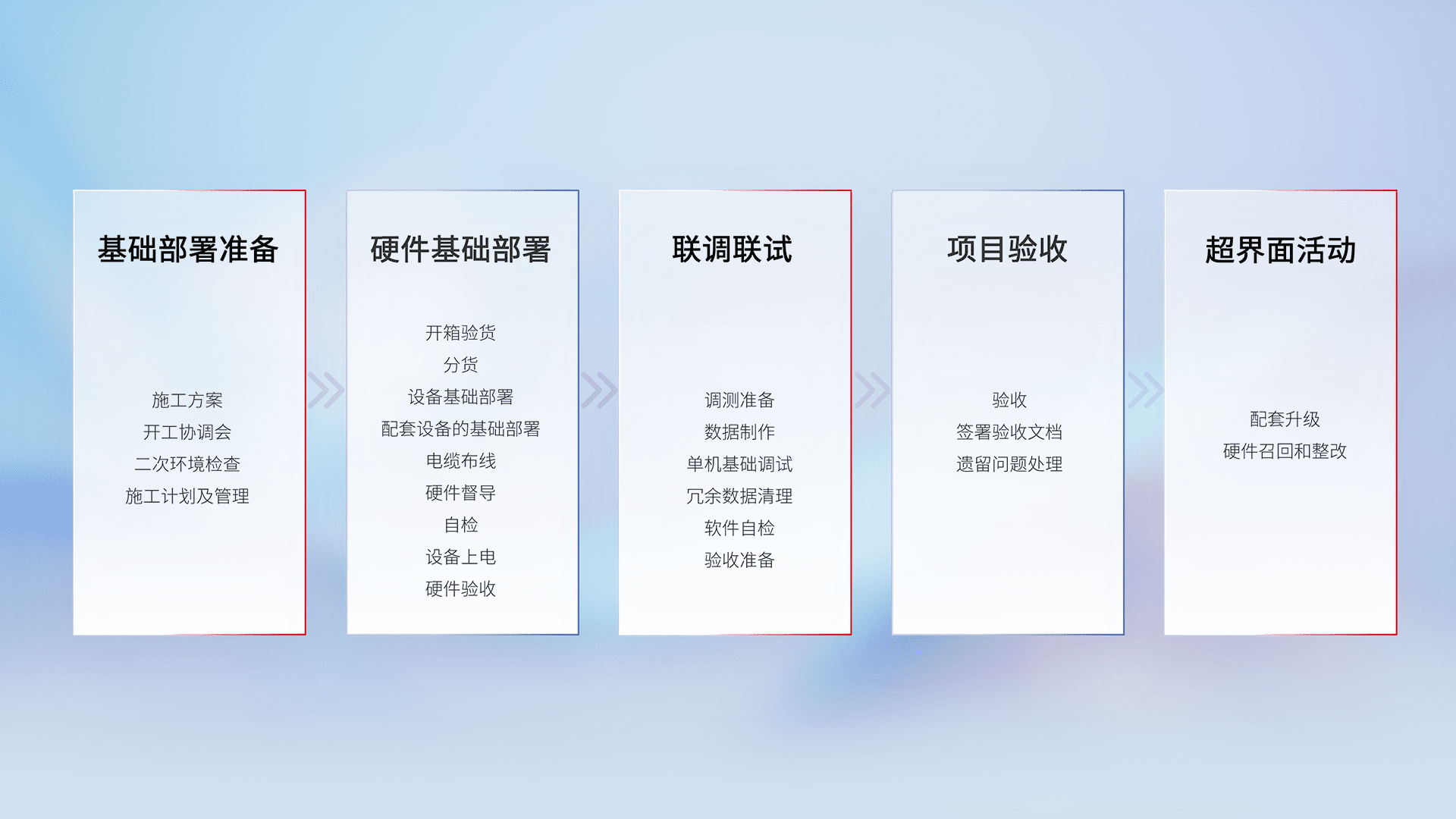 从基础部署准备、、、硬件基础部署、、联调联试、、、、项目验收、、越界面活动的全过程可追溯,,,,保证施工质量和进度。。。。